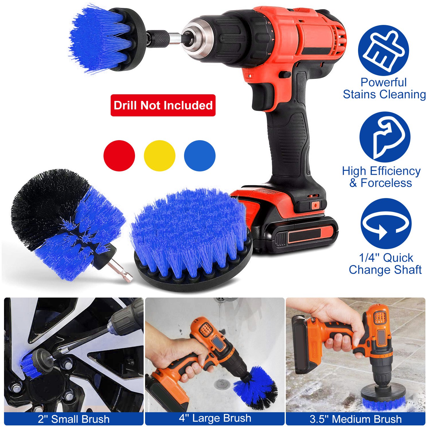 Our drill brush which can be attached to cordless drills with its 1/4'' mounting shaft can exert a deep cleaning to remove stubborn stains and make the time-consuming cleaning work finished quickly. It comes with 3 types of brushes-2'' small brush, 3.5'' medium brush and 4'' large brush to scrub large surfaces, small surfaces, corners, hard-to-reach spots and crevices areas in bathroom and kitchen like tiles, tubs, sinks, toilets, baseboards, fiberglass shower enclosures, shower door tracks, countertops, and other suitable metal/glass/porcelain/plastic surfaces.