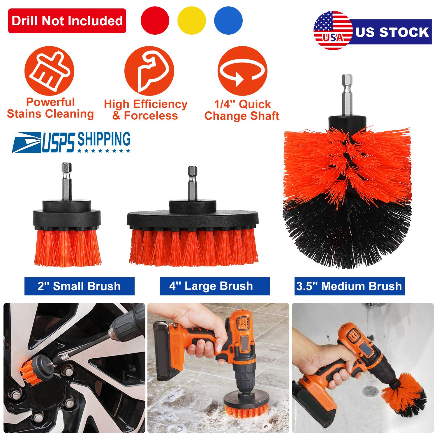 Our drill brush which can be attached to cordless drills with its 1/4'' mounting shaft can exert a deep cleaning to remove stubborn stains and make the time-consuming cleaning work finished quickly. It comes with 3 types of brushes-2'' small brush, 3.5'' medium brush and 4'' large brush to scrub large surfaces, small surfaces, corners, hard-to-reach spots and crevices areas in bathroom and kitchen like tiles, tubs, sinks, toilets, baseboards, fiberglass shower enclosures, shower door tracks, countertops, and other suitable metal/glass/porcelain/plastic surfaces.