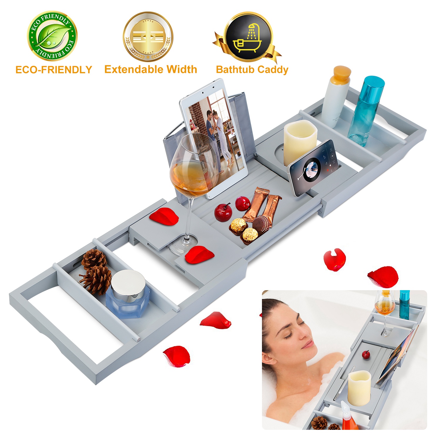 Home > Bathtub Caddy Tray Crafted Bamboo Bath Tray Table Extendable Reading Rack Tablet Phone Holder Wine Glass Holder Shelf Desk Bathroom Spa