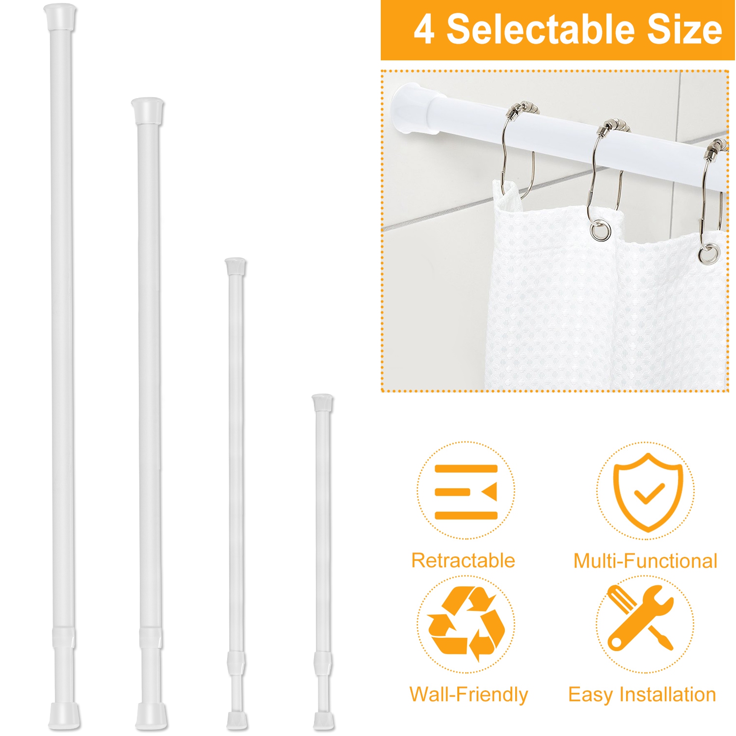 Our tension curtain rod adopts high-grade carbon steel and comes with inbuilt strong spring, which features with wall-friendly non-slip rubber pad, adjust rod length and slim sleek shape. It has strong spring load offering powerful tension between walls to hold 2-3kg/4.4-6.6lbs-Weight objects with its inbuilt high elastic and durable spring. And it comes with 4 sizes (30cm/11.8in, 55cm/21.7in, 85cm/33.5in and 105cm/41.3in) with 4 retractable ranges (30-50cm/11.8-19.7in, 55-90cm/21.7-35.4in, 85-150cm and 105-190cm/41.3-74.8in) for you to choose the fittest size according to your needs, easy to install, removable, no tools, no drilling needed and no damage to wall.