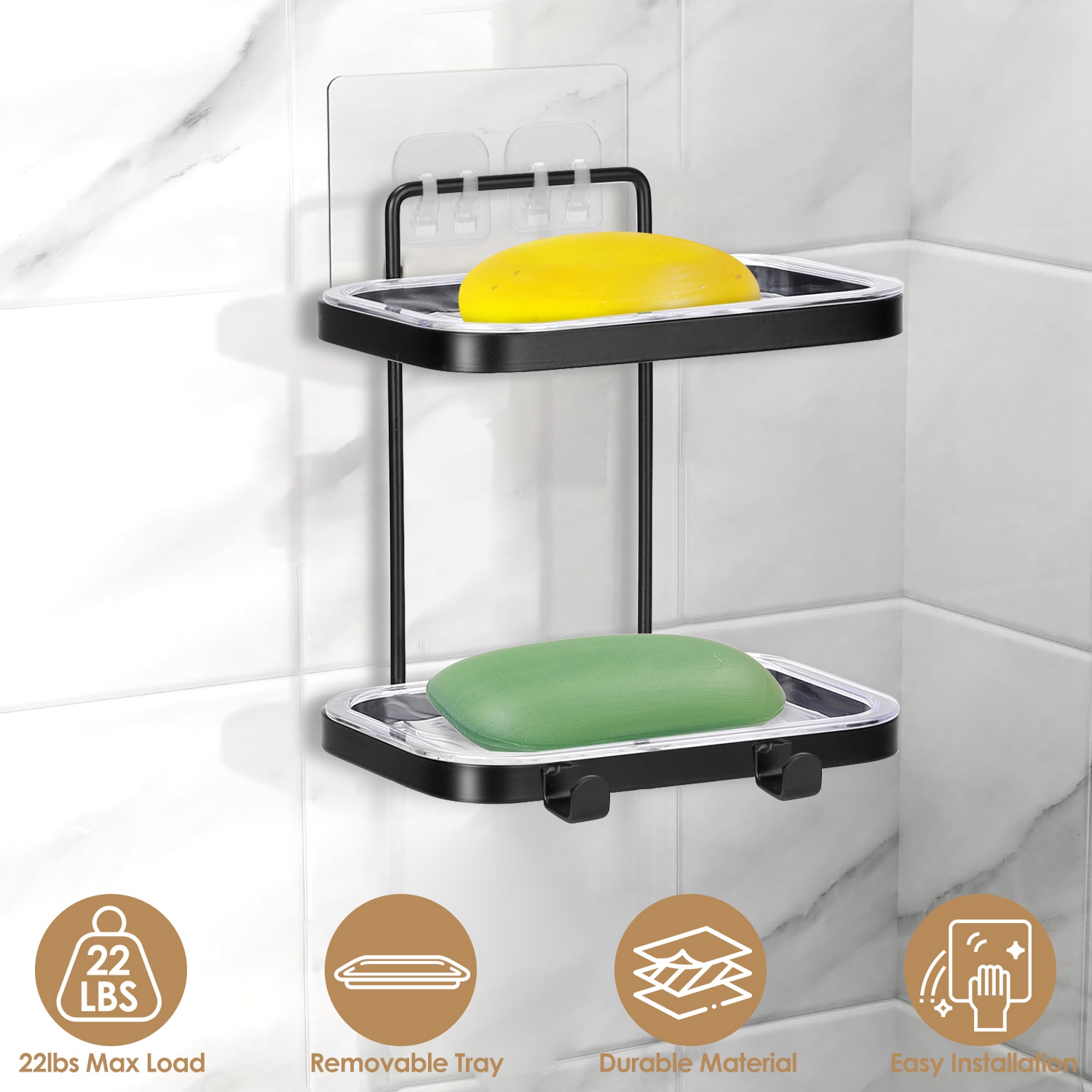 Our soap tray rack is a good choice for your bathroom to store your soap. Iron rack and ABS trays combination design is great for convenient using. Durable iron rack with black painting and strong sticker make it able to hold up to 22lbs. The clear tray can be removed for easy pouring water and cleaning. Solid base is also convenient for you to place your earrings, bracelets, keys and other small items. Also equipped with 2 hooks to hang your bath balls, bath brushes, razors, towel, etc.. Great for bathroom use.