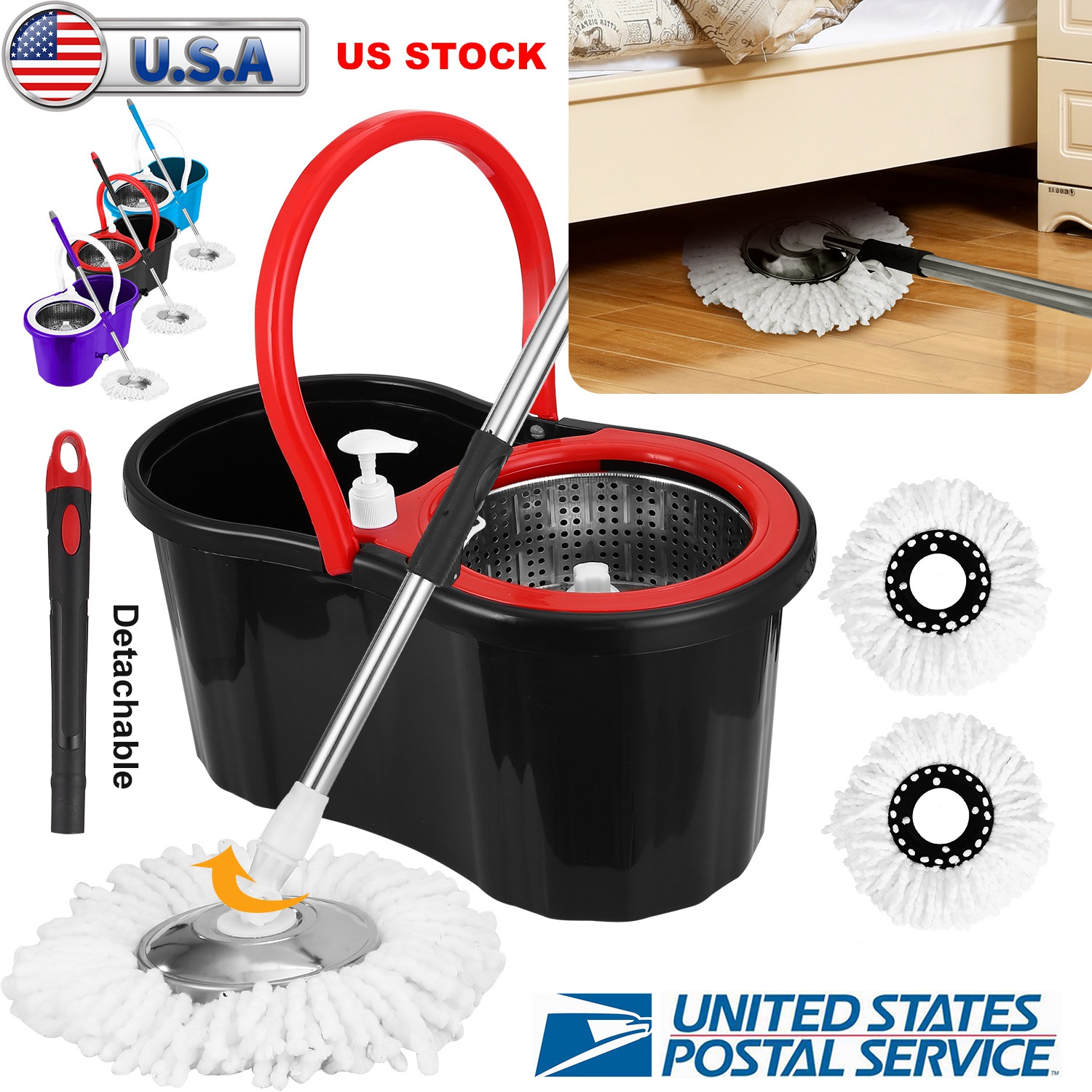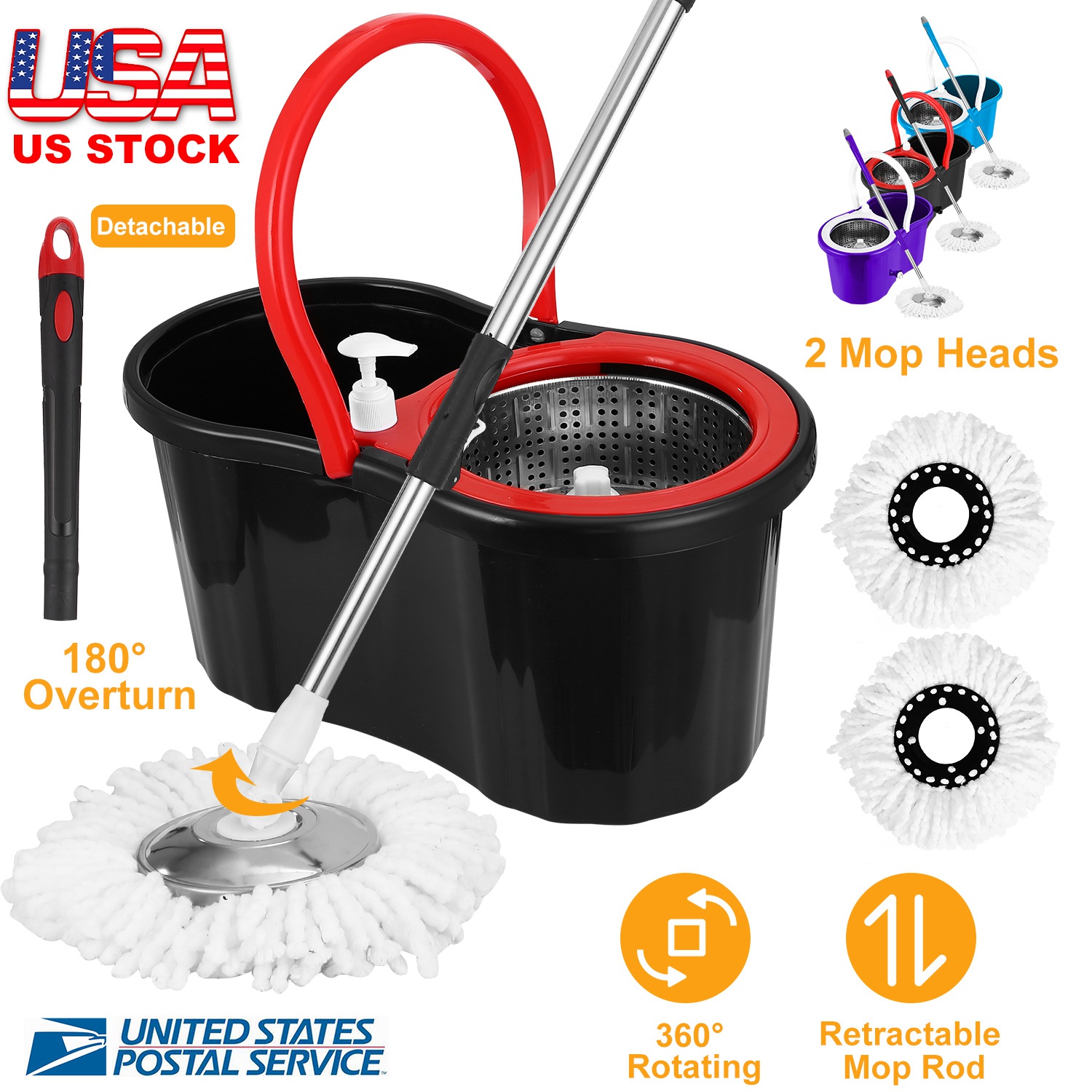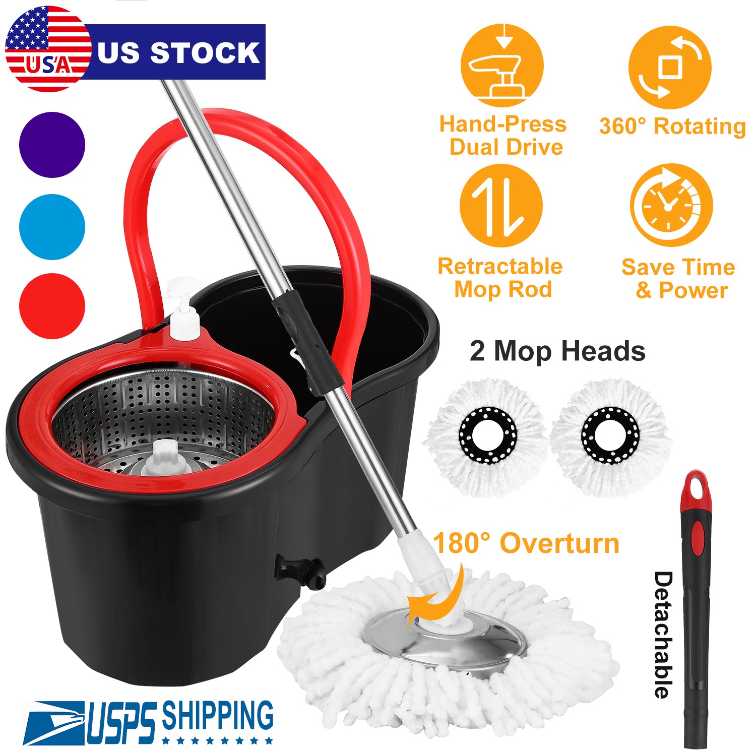 With our Floor Mop Bucket, you will enjoy an effective and efficient cleaning experience with minimal labor and little mess. Features Easy-Press system, which allows you to spin off excess water with only one move, whose dehydration can be up to 90%; Just push the retractable mop rod against the bucket spin wringer basket, then press mop rod to wring mop head dry in seconds. Save your time and effort! Also, it's different from traditional mop, and won't get your hands dirty. What's more, designed with widened flap for detachable splash-guard stainless steel wringer basket which can effectively help prevent the water splash out, leave a fresh and clean sensation behind without excessive spatter dirt on your floors. Also, the 360 swivel head moves flexibly. It can rotate up to 180⁰ in order to clean under your furniture and along baseboards. It's an ideal companion for household cleaning.
