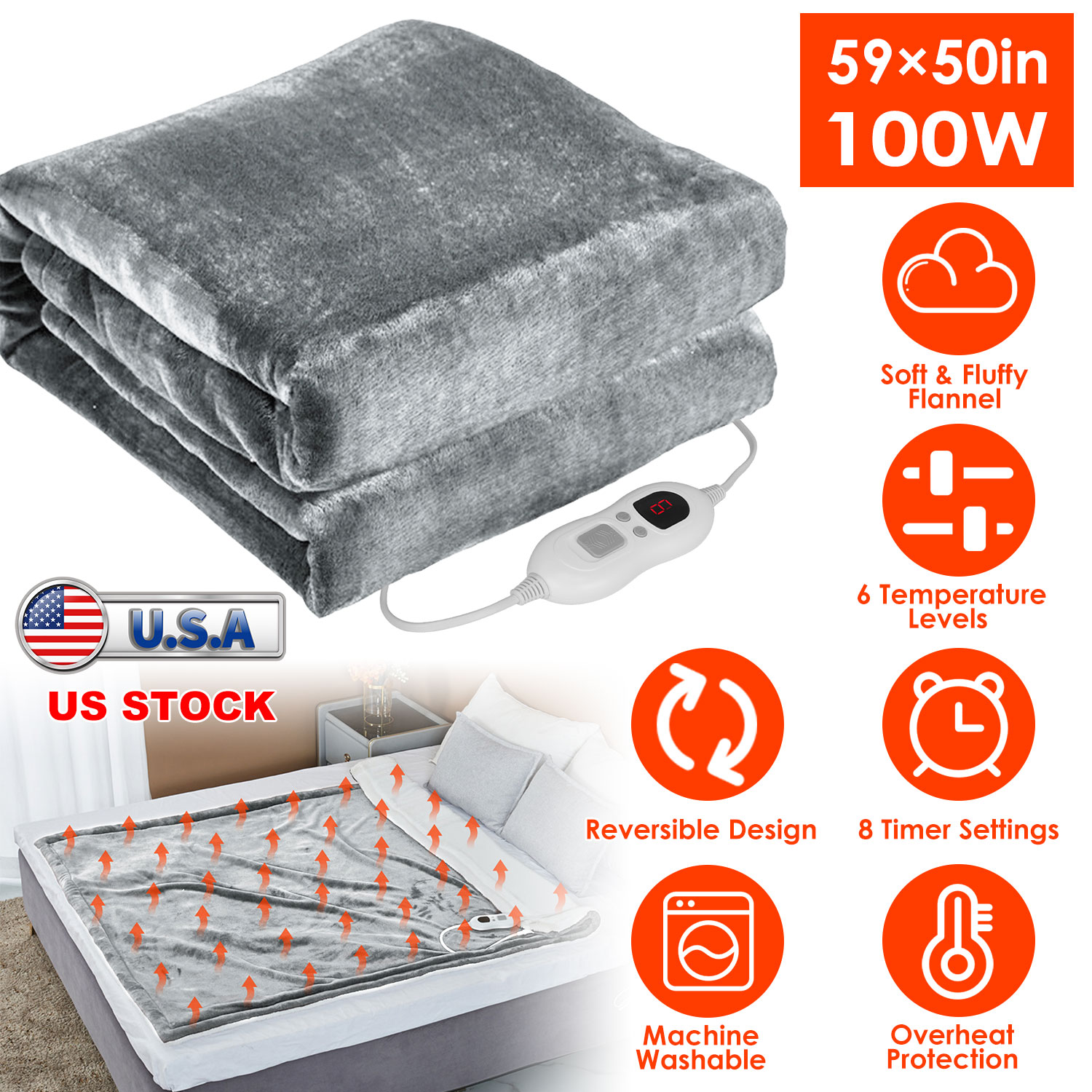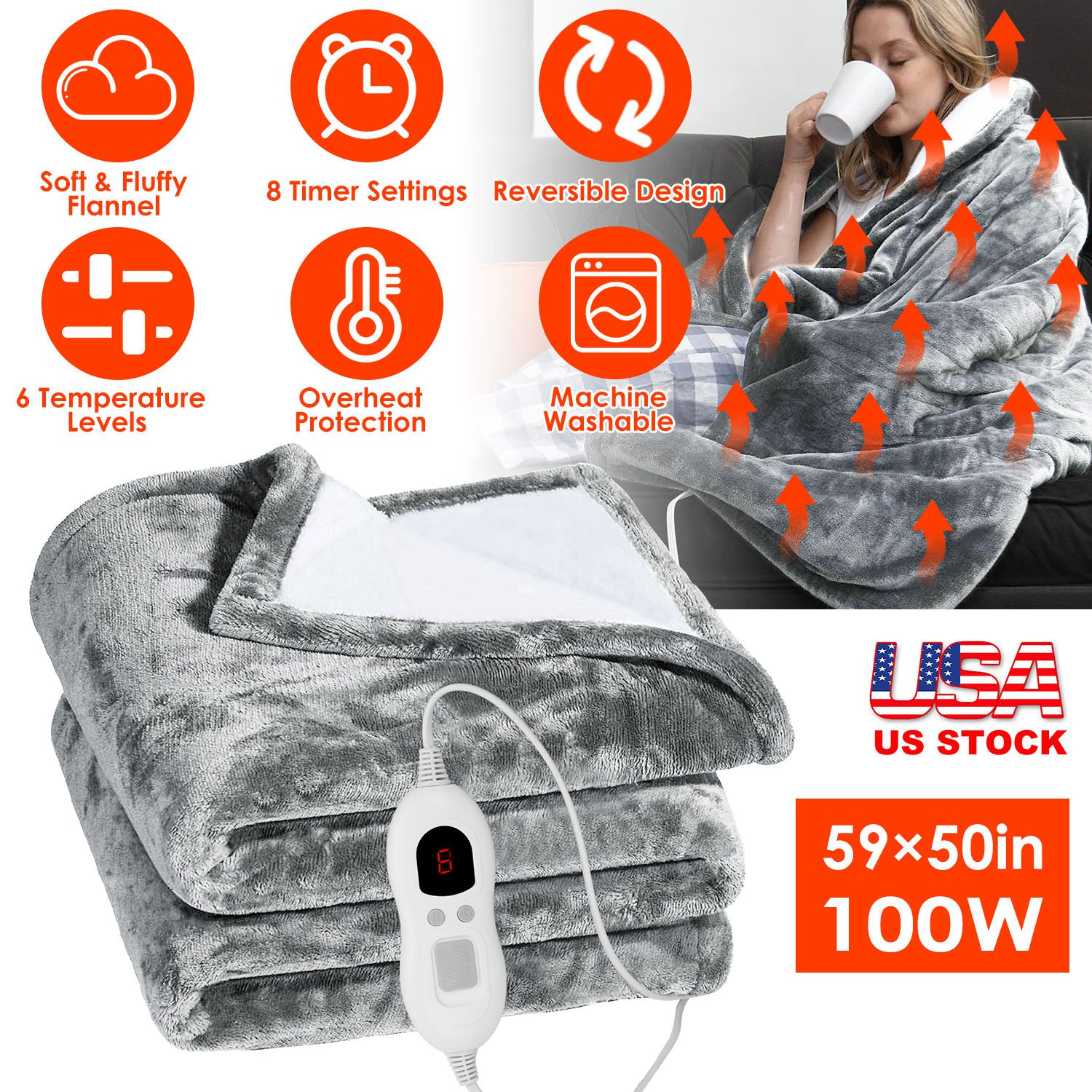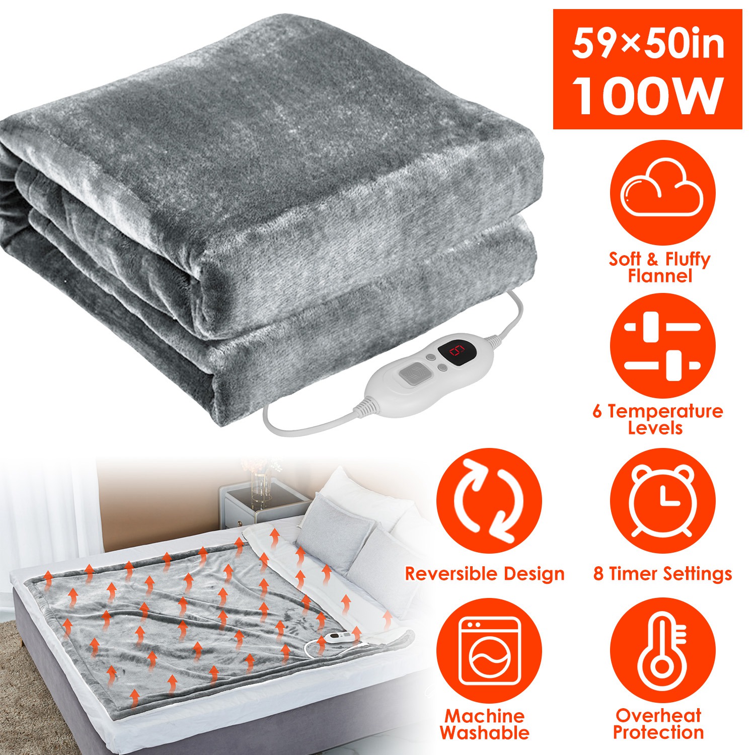 Home > Electric Heated Flannel Throw Heated Blanket with 6 Heat Settings 1-8 Hours Auto off Washable for Home Office Usage 59x50in