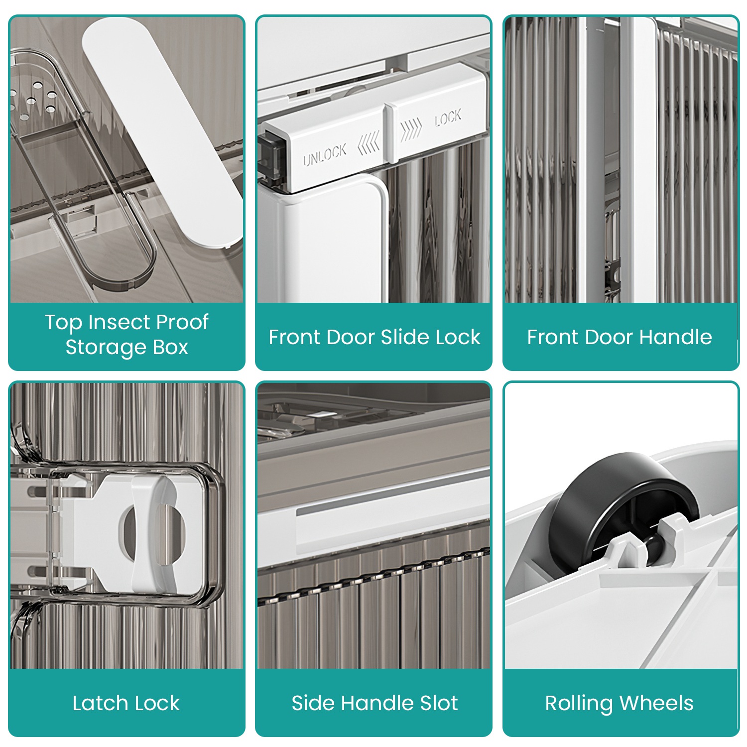 No need tools needed, just take 10s to set up. This free standing storage container with lids and doors is a must have for your house. It can stack together steadily to save space. Store things in a sufficient way by opening the lid, and take out things by opening 4 side doors. Safety lock on the doors ensure no falling of your items when moving the bin. Side handles and 4Pcs bottom wheels bring you much convenience when moving. Great to place it in bathroom, kids’ room, kitchen, etc. to hold snacks, wine, drinks, toys and more. 74.7QT/32.6QT, white/yellow/green storage bin can be selected according to your needs.