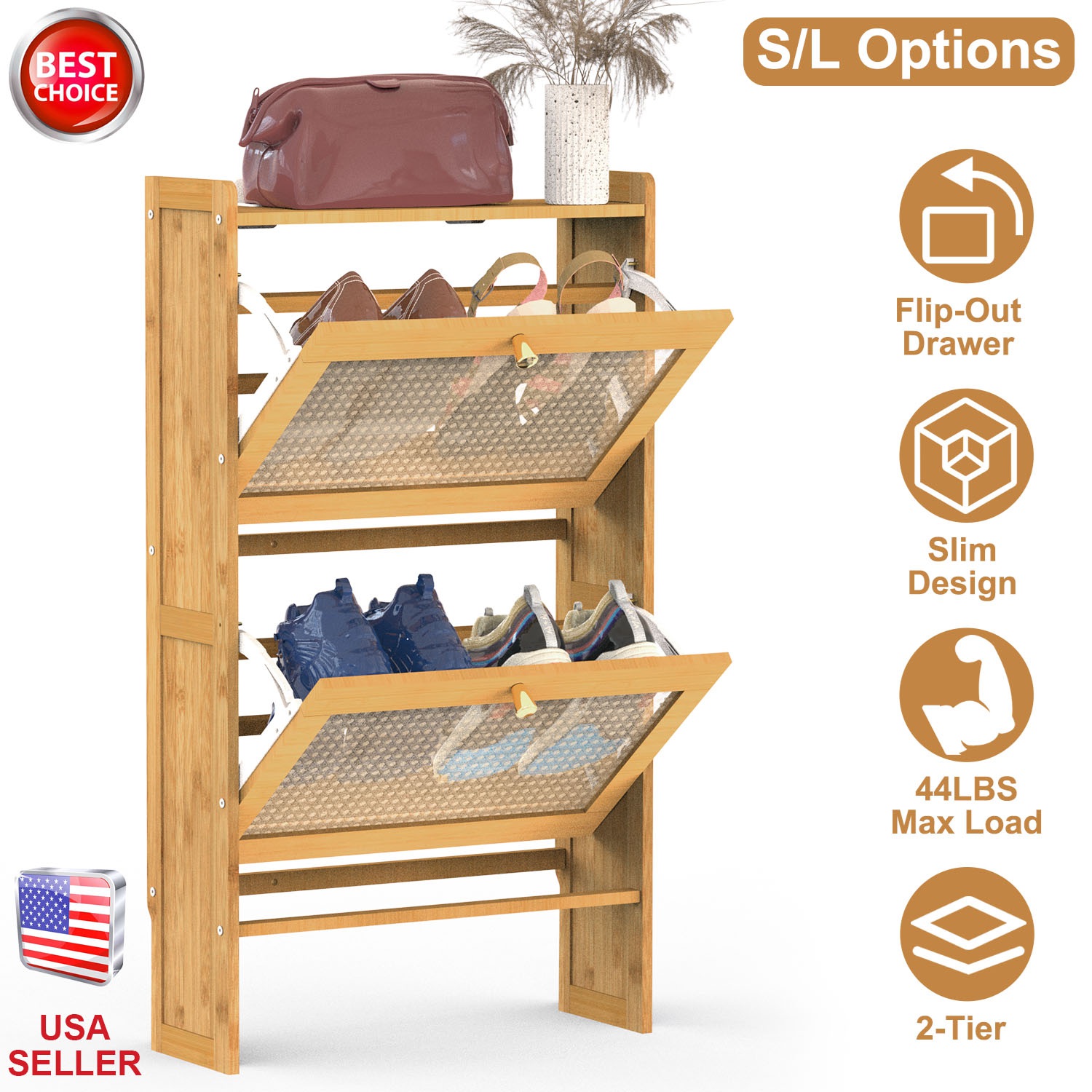 Do you want to store your shoes and keep your entryway tidy in an elegant way? Our 2-tier shoe cabinet is a good choice for you! The natural bamboo material with varnished surface makes it more smoother without burr, looks more classic and stylish, great to match your home decoration. Flipping drawer design makes it easy to open and close and also slim enough for any tight hallway. Able to hold about 6 pairs/4 pairs of shoes with different sizes and store other small items on the top with 44lbs max load. T-shaped buckles make it not easy to fall down, ensuring max stability and safety. And the mesh hollow door panel ensure excellent air ventilation, making your shoe rack always keep dry without smell. Suitable for hallway, entryway, living room and anywhere you like.