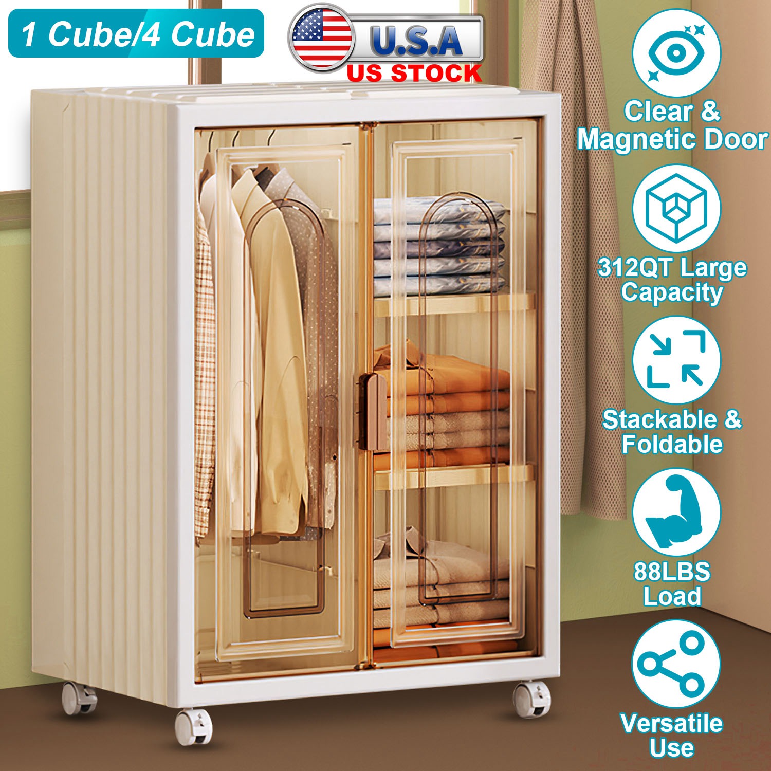 Looking for a simple closet for your baby clothes?Our small storage cabinet boasts 312QT large space and 88LBS weight capacity that are able to store clothing, toys, books, bedding, snacks, drinks, tools and more. Offers 2 options, 1 Cube and 4 Cube. 1 Cube Closet is suitable for hanging summer clothes or storing folded clothes. 4 Cube Closet contains 4 compartment with different sizes, which enables you to categorize different clothes, such as 1 big compartment for hanging your daily wearing, 3 small compartment for underwear, towels, skincare products etc.. Clear and magnetic doors ensures quick access for clothes. You can move this closet anywhere you want with 4 flexible wheels, 2 of them lockable for stability. Easy to fold it down when not in use. Stackable for more storage possibilities. An ideal large capacity storage bin in home!