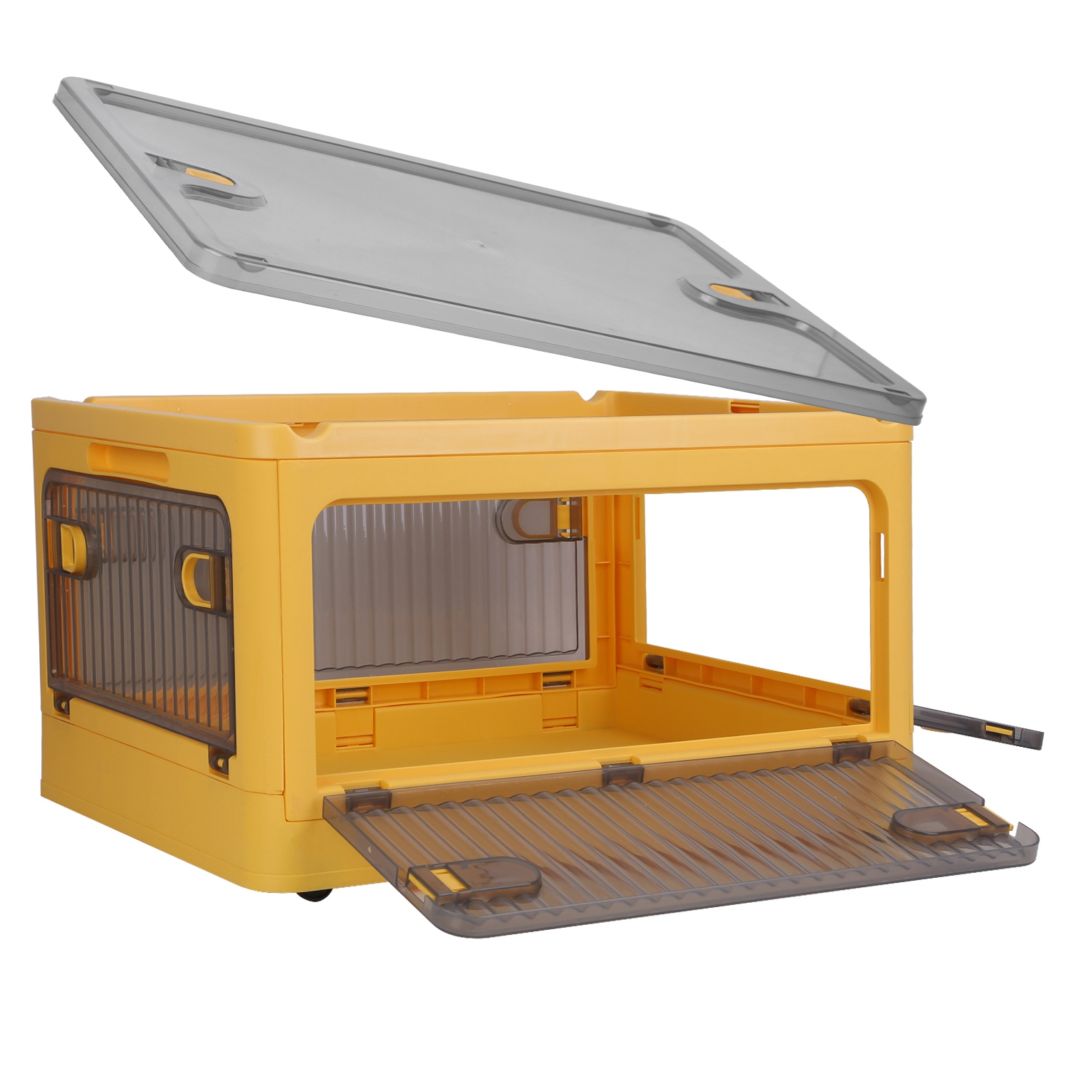 No need tools needed, just take 10s to set up. This free standing storage container with lids and doors is a must have for your house. It can stack together steadily to save space. Store things in a sufficient way by opening the lid, and take out things by opening 4 side doors. Safety lock on the doors ensure no falling of your items when moving the bin. Side handles and 4Pcs bottom wheels bring you much convenience when moving. Great to place it in bathroom, kids’ room, kitchen, etc. to hold snacks, wine, drinks, toys and more. 70QT/31QT, white/yellow storage bin can be selected according to your needs.