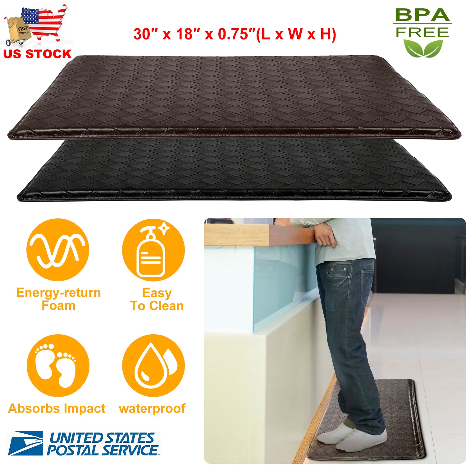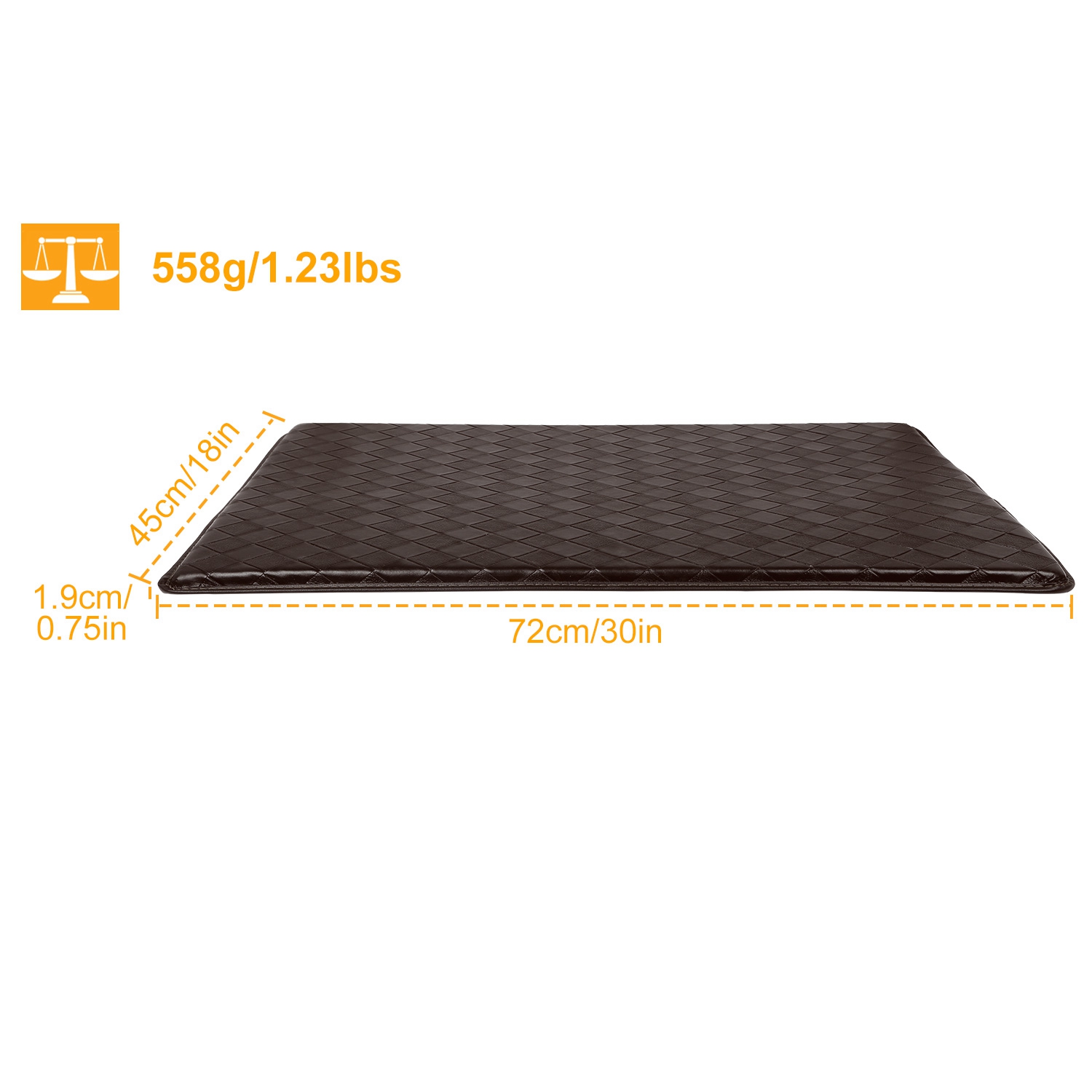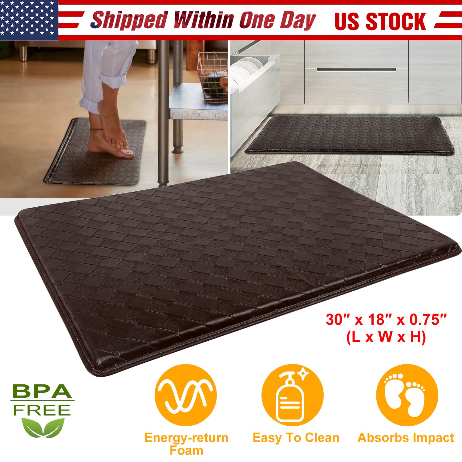 Imagine being relaxed while you do the dishes, fold laundry, or work at your standing desk. Make that a reality with our anti-fatigue Mat! It is extra thick (0.75in) and made of high quality memory foam inside, which bounces from your moves to provide great comfort to you when standing on it. The checkered pattern on top serves to well message your feet soles and prevent from slipping, and the rubber bottom stops it from moving. You can totally relax and enjoy your time in your standing time.