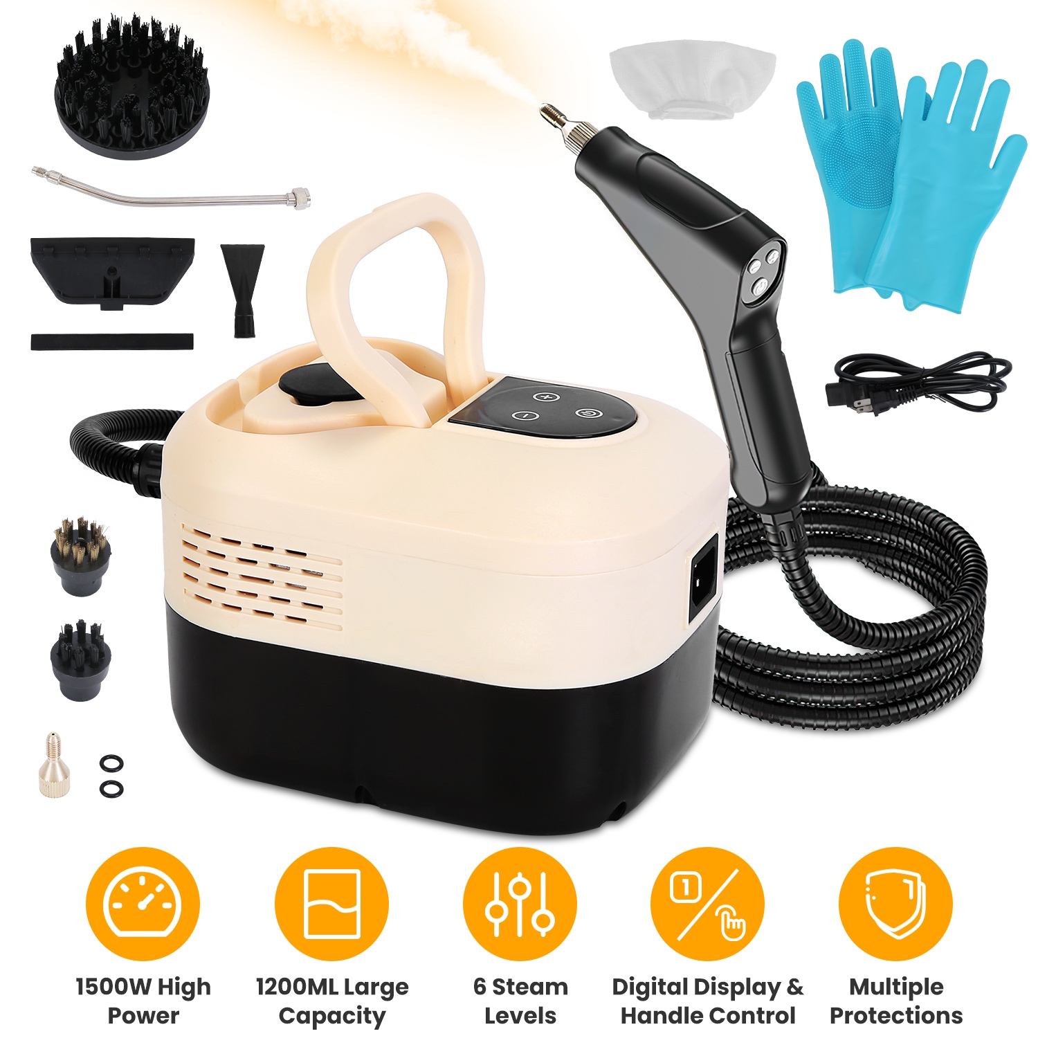 Transform your cleaning routine with this versatile handheld steamer cleaner. This 1500W handheld steamer cleaner generates 3.5 Bar pressurized steam at 212℉ in 15s, killing 98.9% of bacteria. With 6 adjustable steam levels, it handles tasks from light dusting to heavy degreasing. Its 1200ML tank provides 1 hour of continuous steam. Features dual control, digital display, overheating and dry burning protections. The comprehensive kit includes various attachments for diverse surfaces, offering safe, versatile cleaning for home and more.