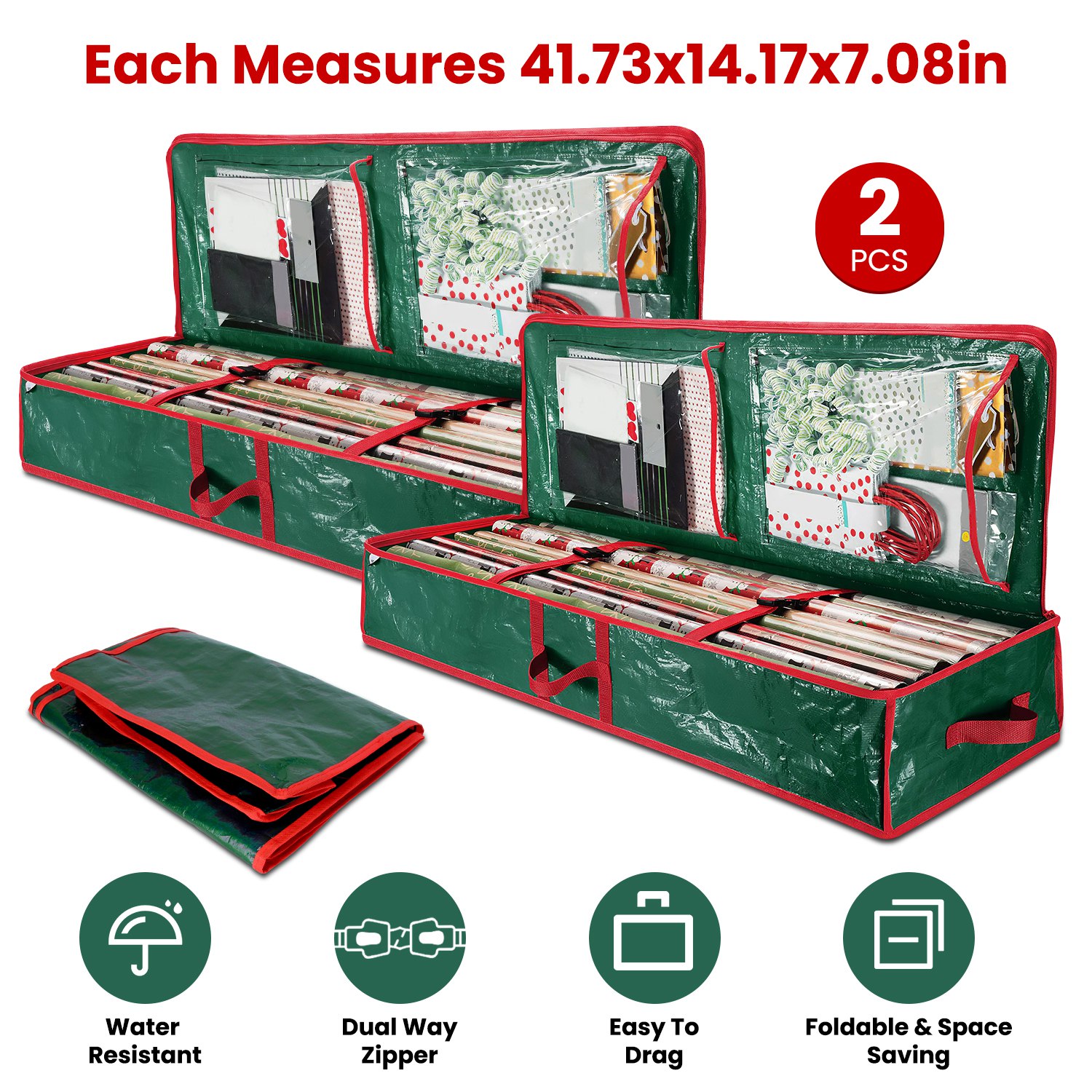 Home > 2Pcs Christmas Wrapping Paper Storage Containers Foldable Water Resistant Gift Wrap Organizer with Pockets Handles for Ribbon Card Bows Gift Bag Under