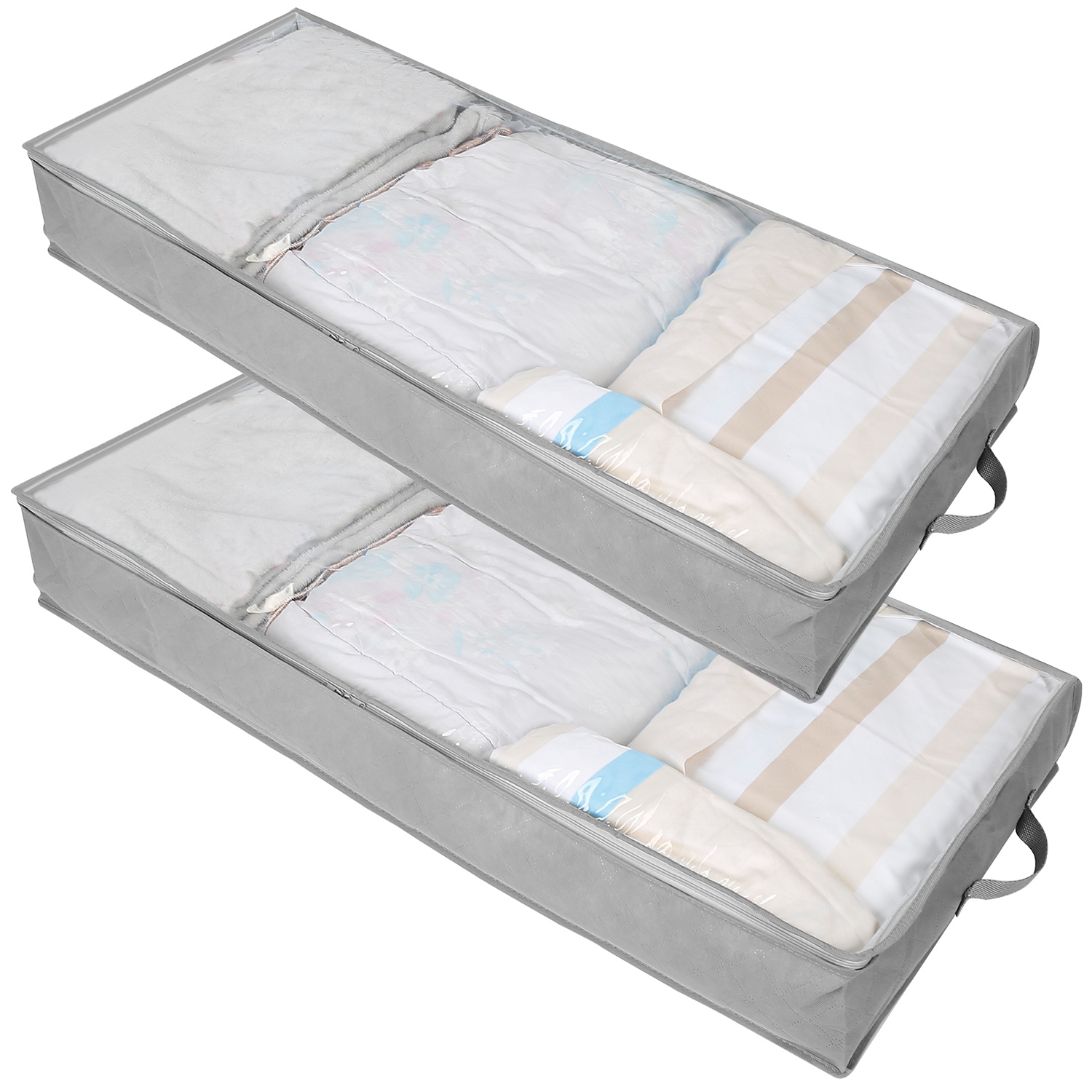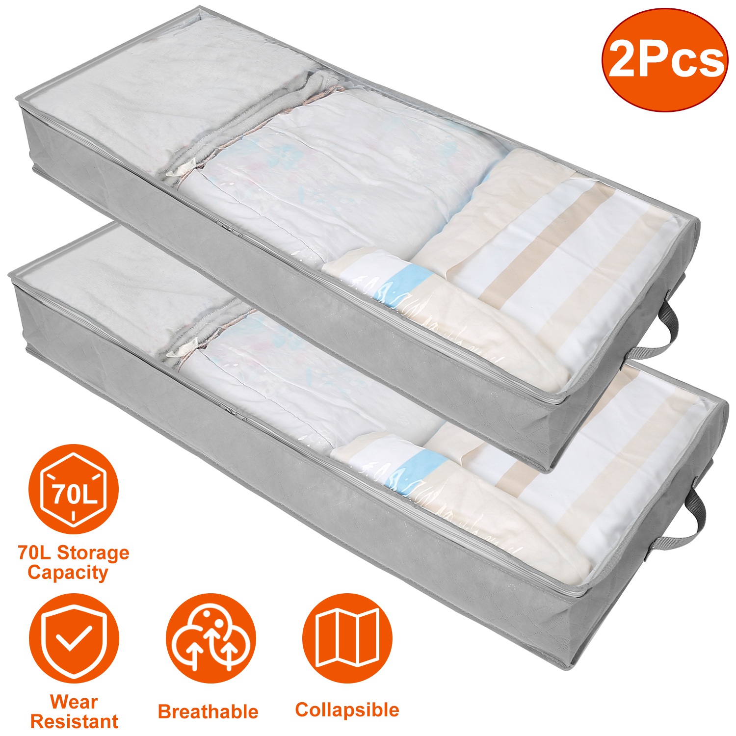 2Pcs 70L Foldable Underbed Clothes Storage Bags Moisture Proof Zipped Organizer Cube Quilt Pillow Blanket Closet Box Bin w/ Transparent Window Dual Si