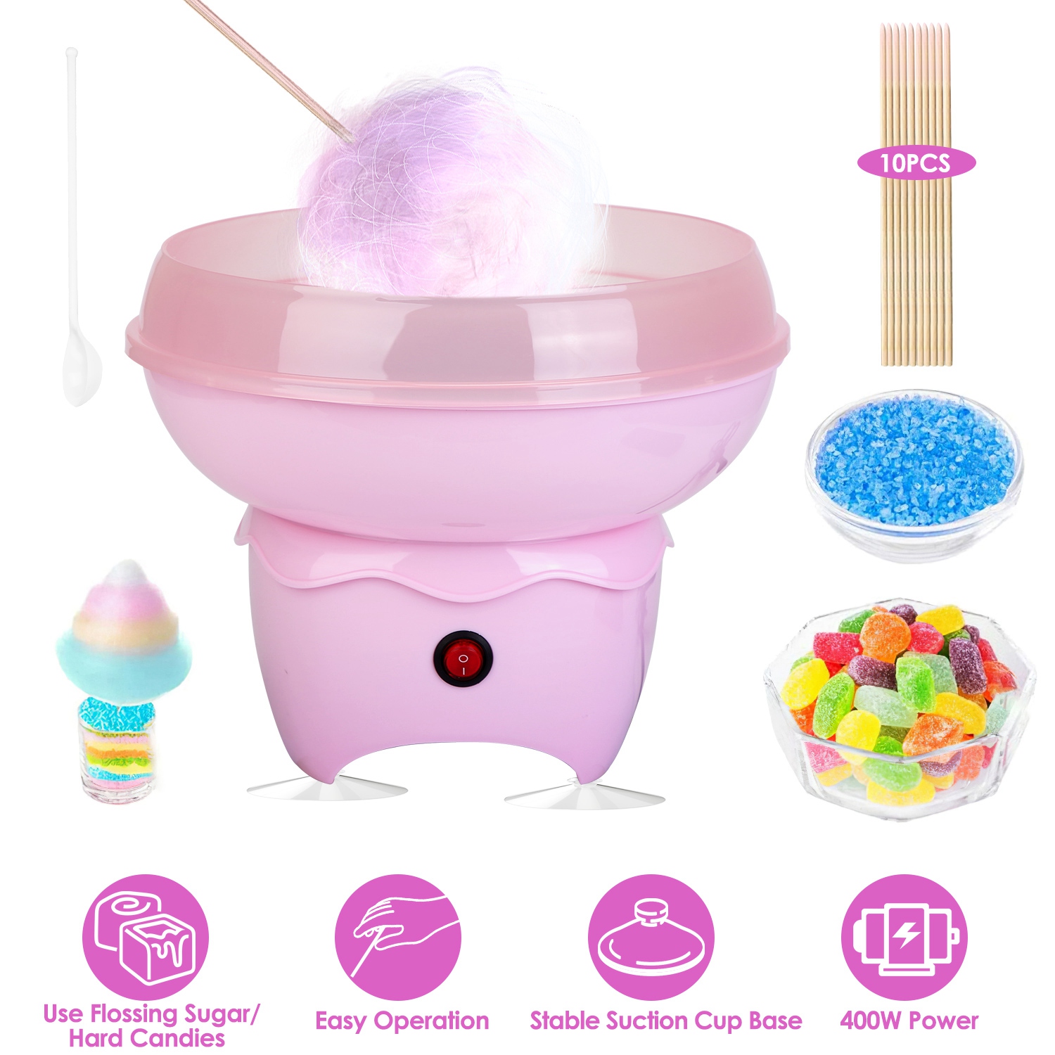 Take this cute cotton candy machine home and render your kids a funny and sweet childhood. Create yummy cotton candy and have fun time together. Simply add traditional flossing sugar or your favorite hard candies into the unique extractor head with our sugar scoop to make delicious cotton candy. We also offer 10 bamboo skewers for convenient using. Made from advanced PP and stainless steel material, safe and healthy. Besides, 4 suction cups on the bottom can effectively keep the machine stand in place during use. Perfect gift for your kids to enjoy fun during creating cute and sweet cotton candy, bringing fun for the whole family.