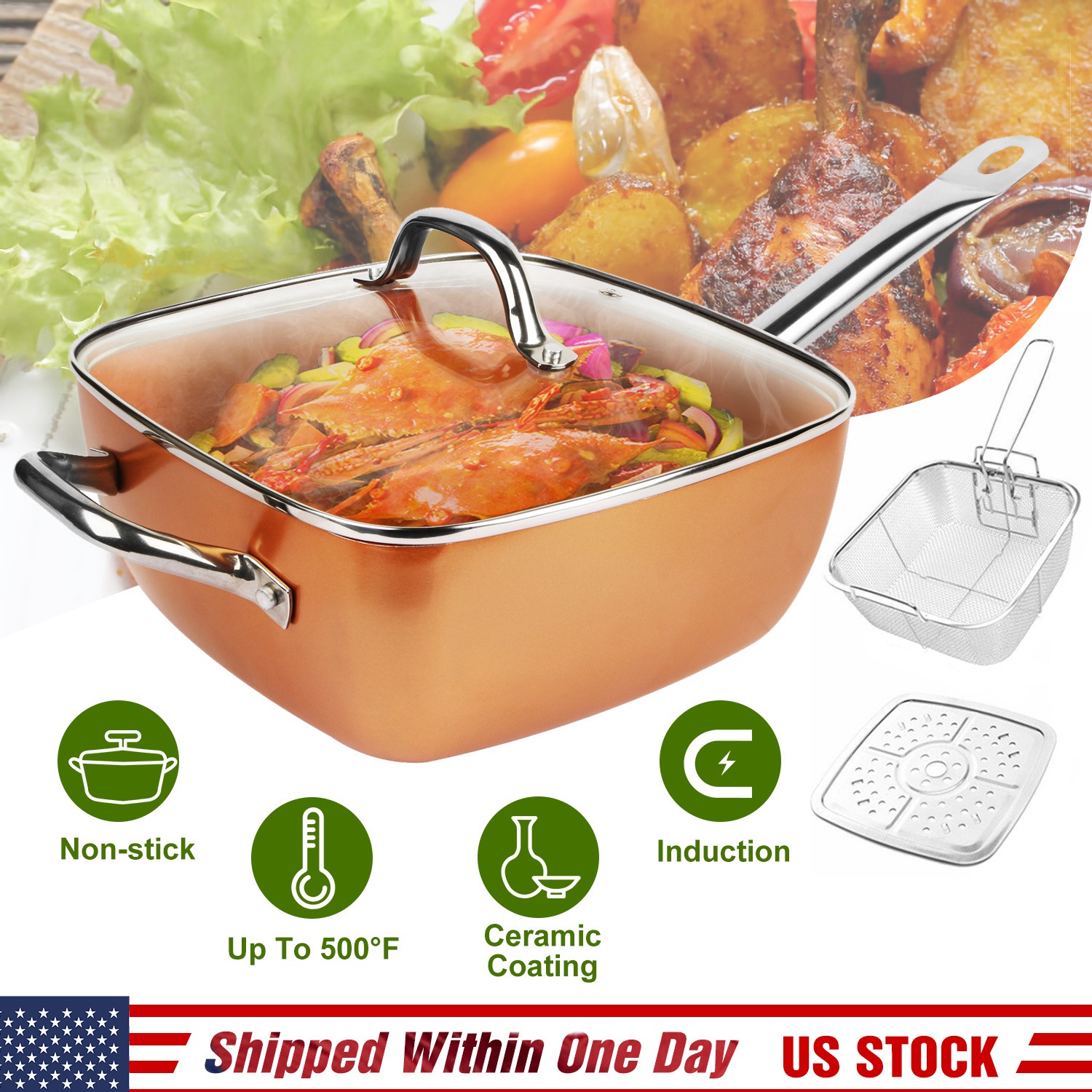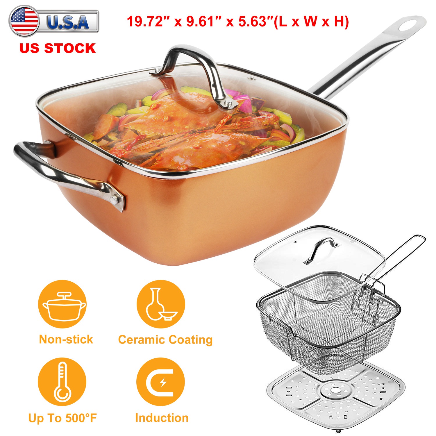 This multi-function frying pan with induction bottom is ideal for electric, induction and gas stoves. You can use it to fry, boil and steam food as you prefer owing to the accessories attached, and cook the food completely in one pan due to the deep sides. The ceramic coating free of PTFE, PFOA and PFOS makes for non-stick and easy cleanup. Fast heating and cool down helps save the cooking time.