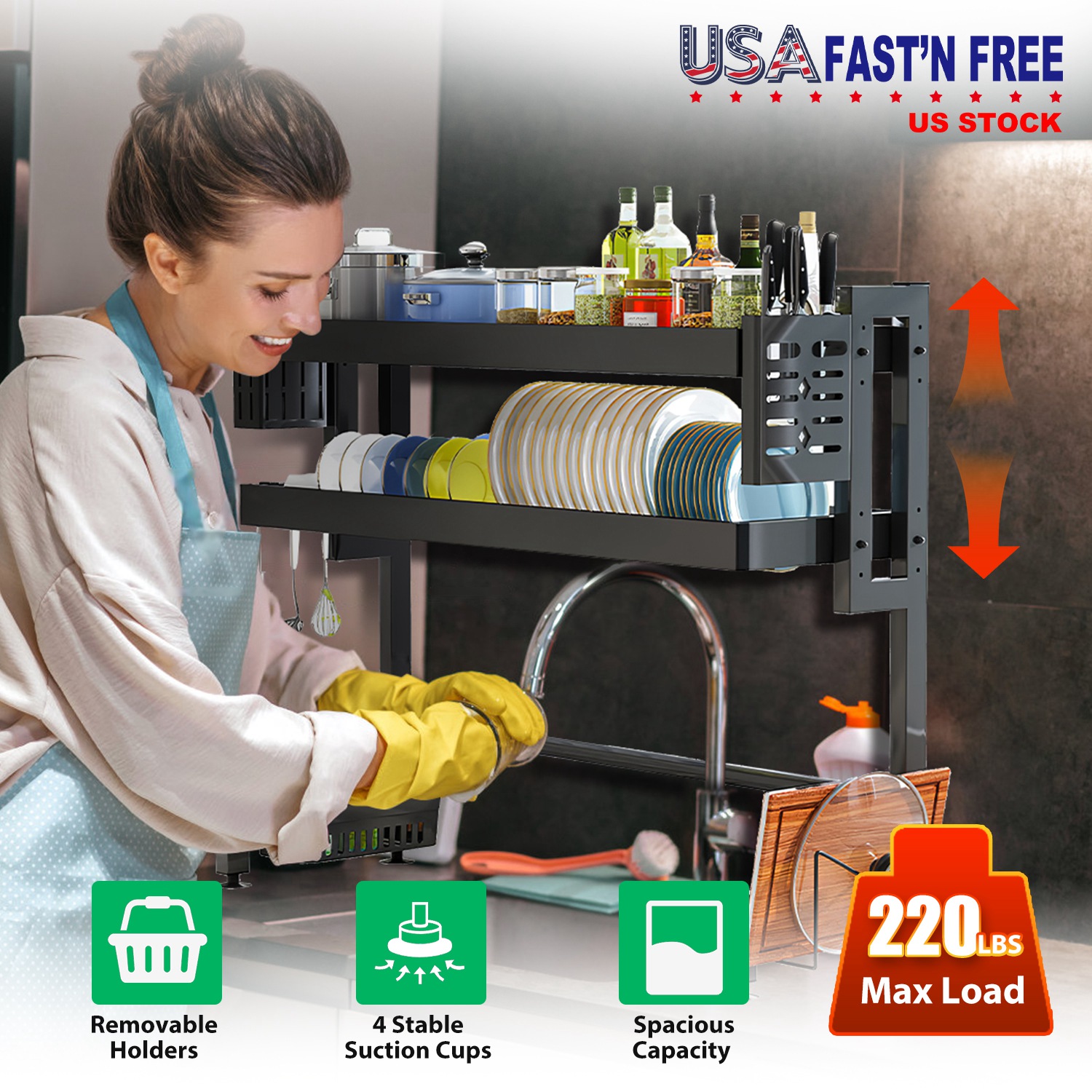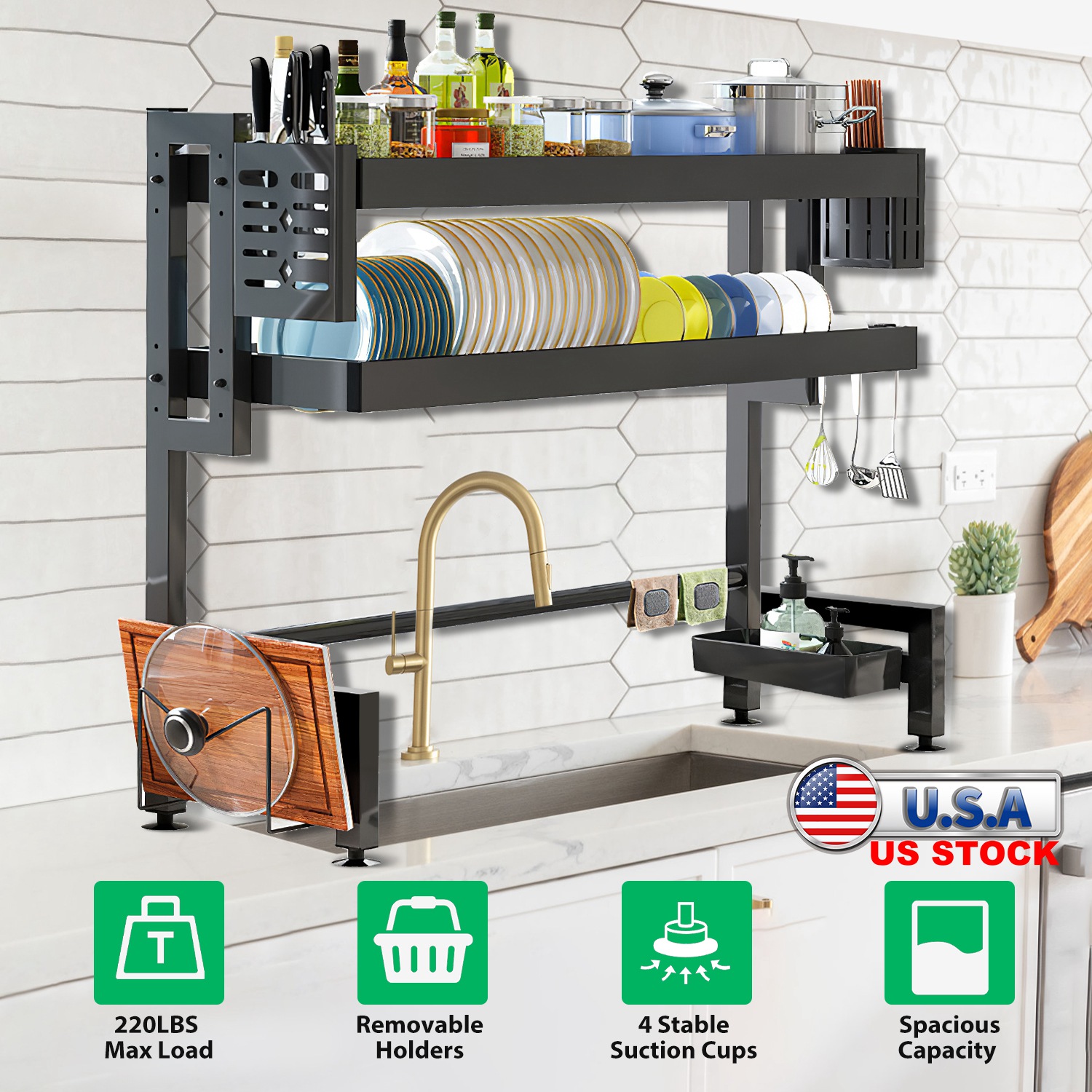 It’s time to say goodbye to wet countertops and stained utensils. If you’ve washed your utensils without the help of a dishwasher, then you will know how handy a dish rack can be. Our practical over sink dish drying rack with 2 tier racks including 1 fruit & vegetable basket and 1 plate & bowl rack, and comes with 1 knife holder, 1 utensil holder, 1 cutting board rack, 1 detergent basket and 6 utility hooks, aims to make all the counter stuffs tidy and dry easily and greatly save limited space on the countertop. It can hold a large amount of items up to 220lbs, which allows you to store all the dishware such as bowls, plates, pans, utensils, cutting board, knives, vegetables and fruits, detergent, rags, etc.. A definitely necessary kitchen organizer to keep you away from past chaos!