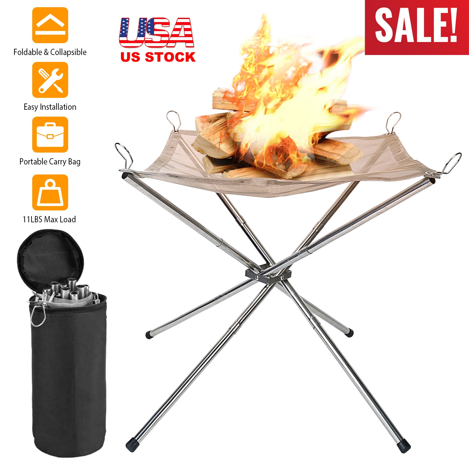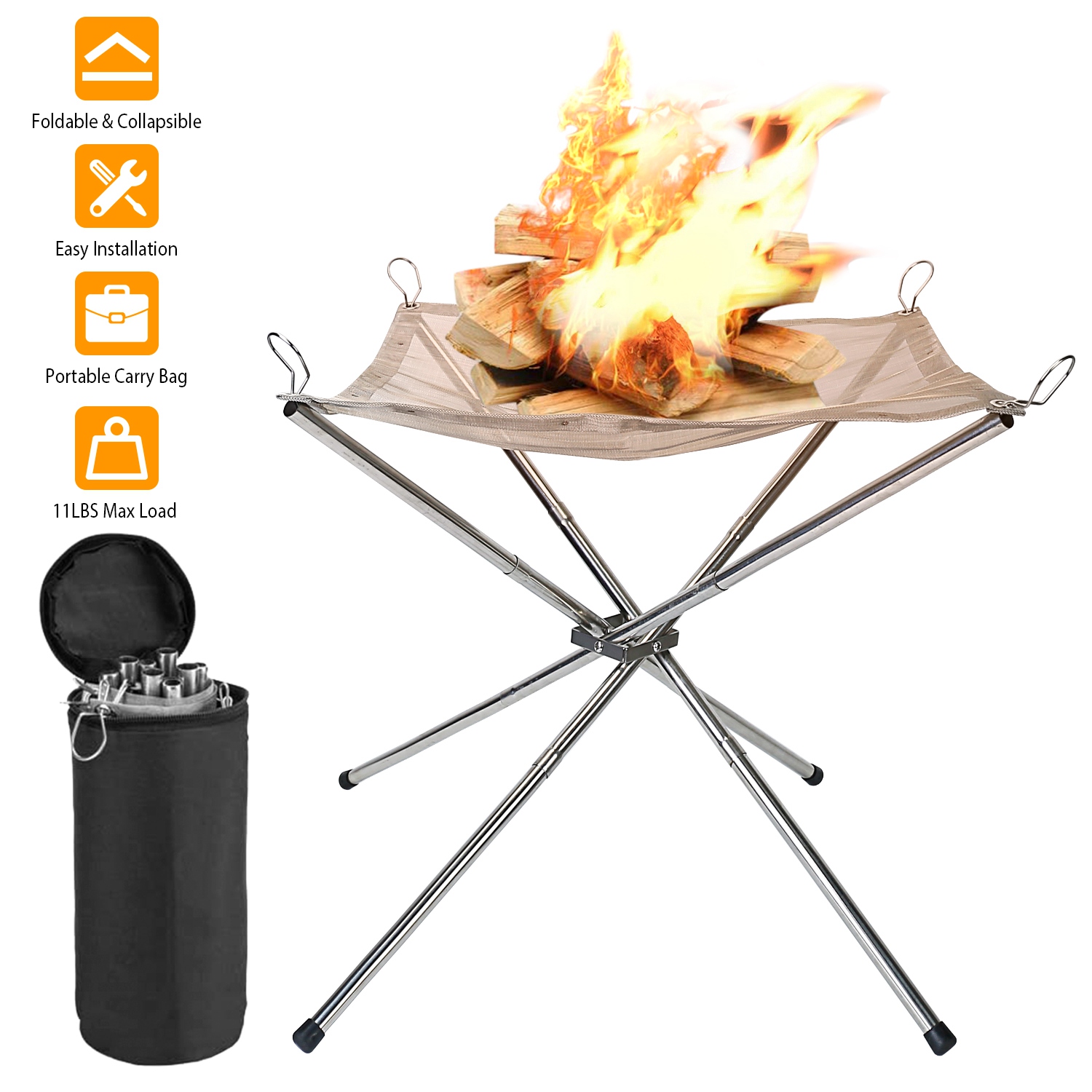 Made of premium heat-resistant 201 stainless steel, our portable outdoor fire pit can support enough burning wood stably up to 11lbs, allow you to enjoy the warmth and beauty of campfires. Its collapsible design and the carry bag make it a best choice for outdoor wood burning! Just pour out the ash after each use then you can use it the next time!