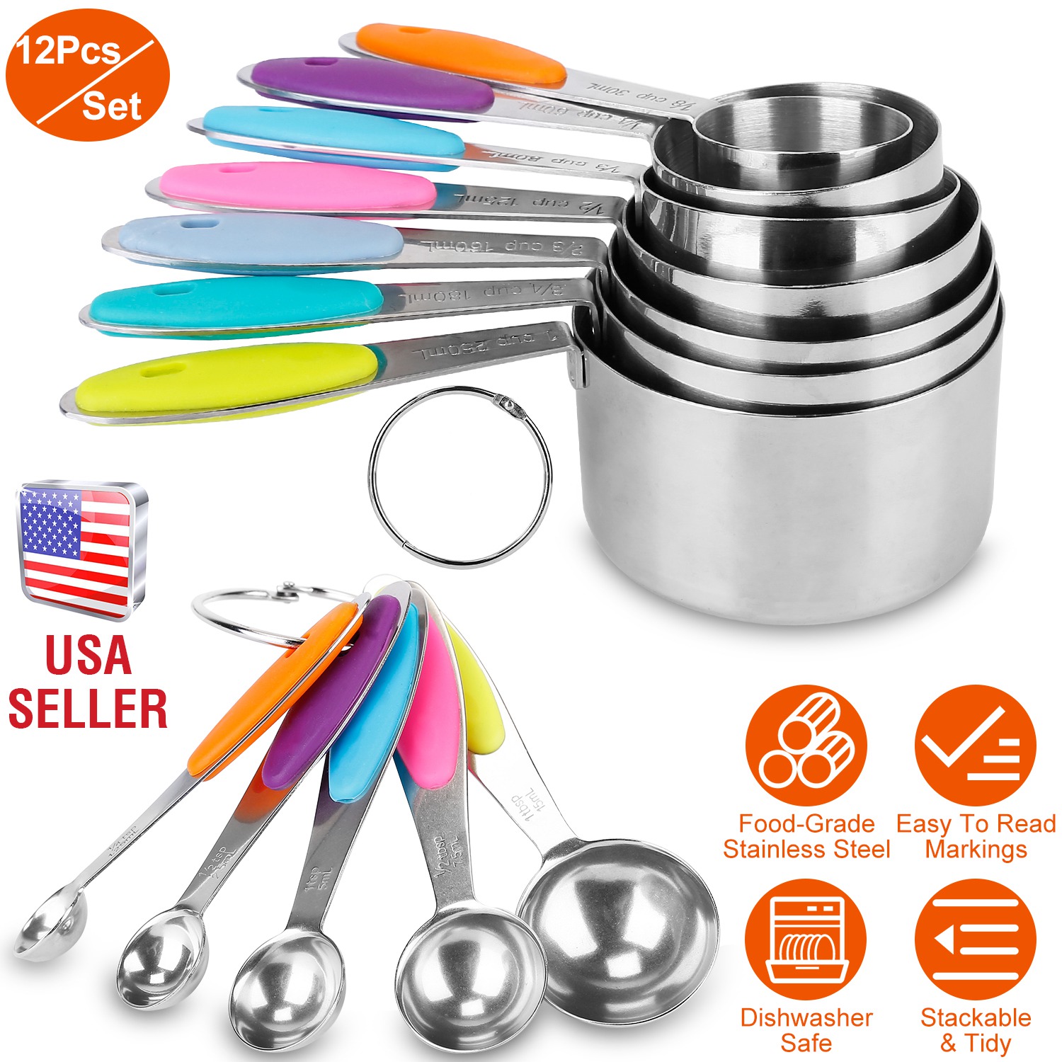 12Pcs Measuring Cups Spoons Set Stainless Steel Kitchen Measurement Tool for Cooking Baking Dry Spices Liquid Ingredients Easy to Read Markings