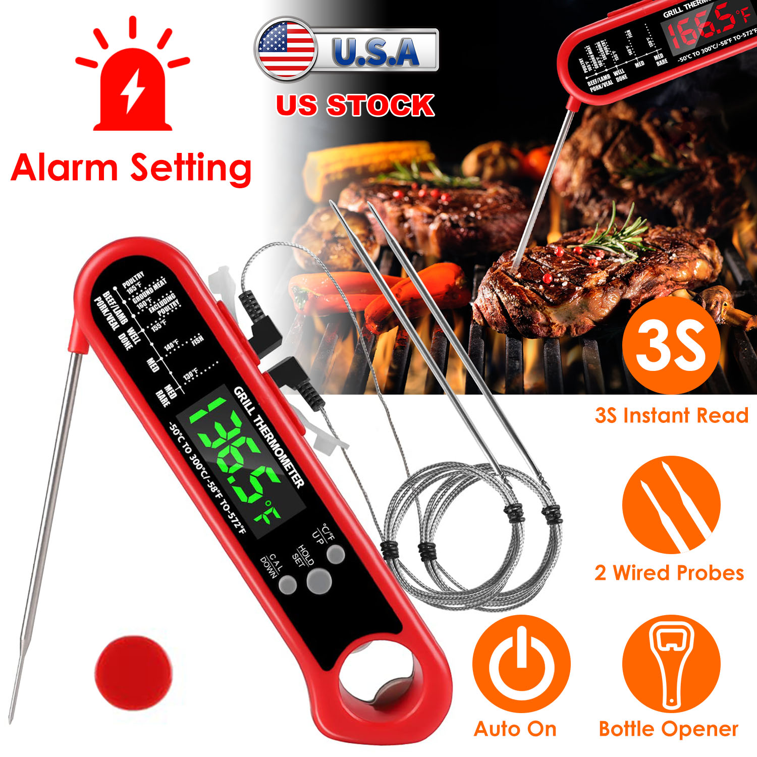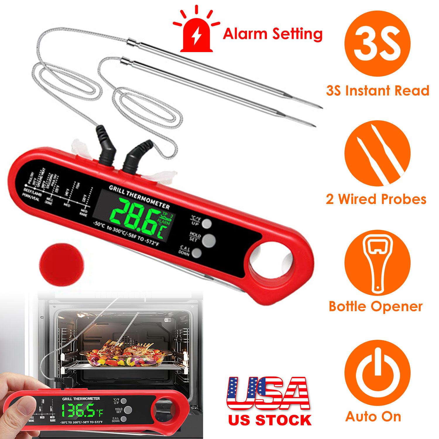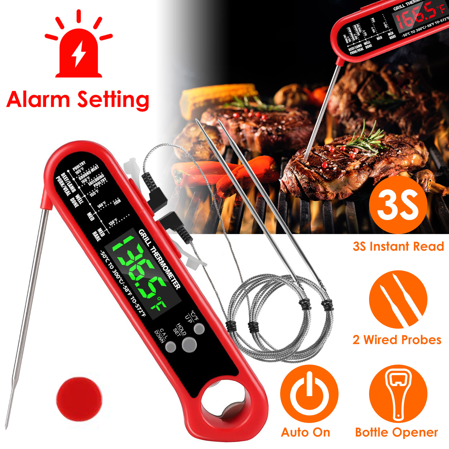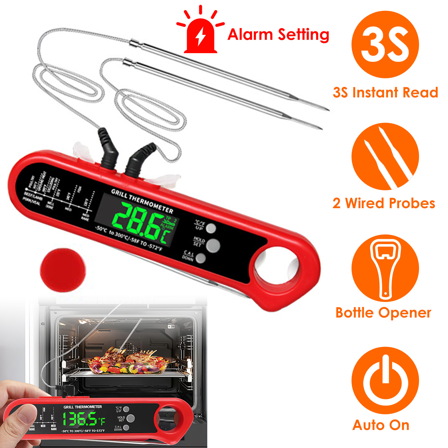 Whether it's a juicy steak on the grill or your Thanksgiving turkey, it's extremely important to have an accurately calibrated meat thermometer in the kitchen. This instant read thermometer comes with two external probes with 39.4in wire, which turn the thermometer into an oven/smoker safe one. Besides, the alarm function can remind you of removing meat from oven or smoker in time once reaching the preset temperature, an useful function for you when you are busy cooking.