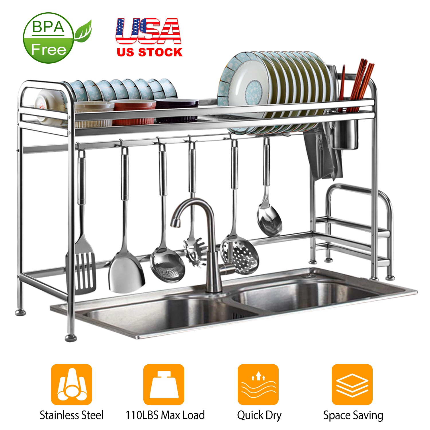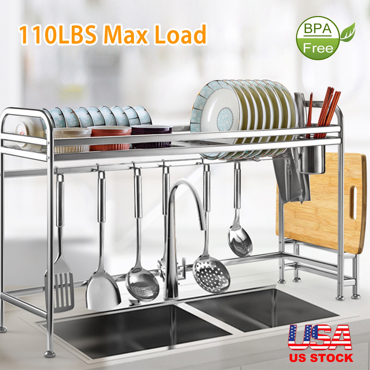 Home > Over Sink Dish Drying Rack Shelf Stainless Steel Kitchen Countertop Bowl Dish Chopping Board Organizer Rack w/ Cutlery Holder