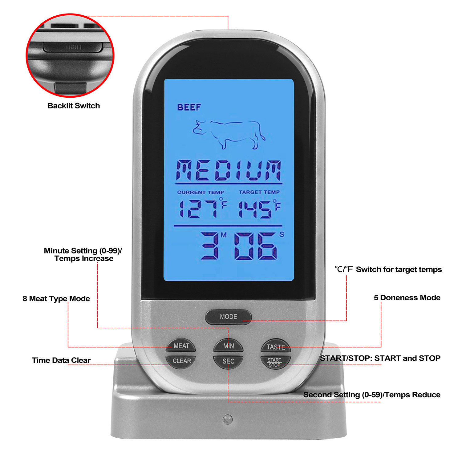 The digital meat thermometer includes a receiver with large backlit LCD and a transmitter with a stainless steel probe, which can offers a 98ft/30m wireless monitoring and operation. It supports test and monitors 8 type of meat and 5-level taste, you can free choose from the included meat type and level of tastes as your will without any worry, because the thermometer will alert you when the meat temperature reaches to pre-set parameter. Moreover, its timer function allows you to set up cooking time. It is a useful tool for BBQ, smoking meat or cook use.