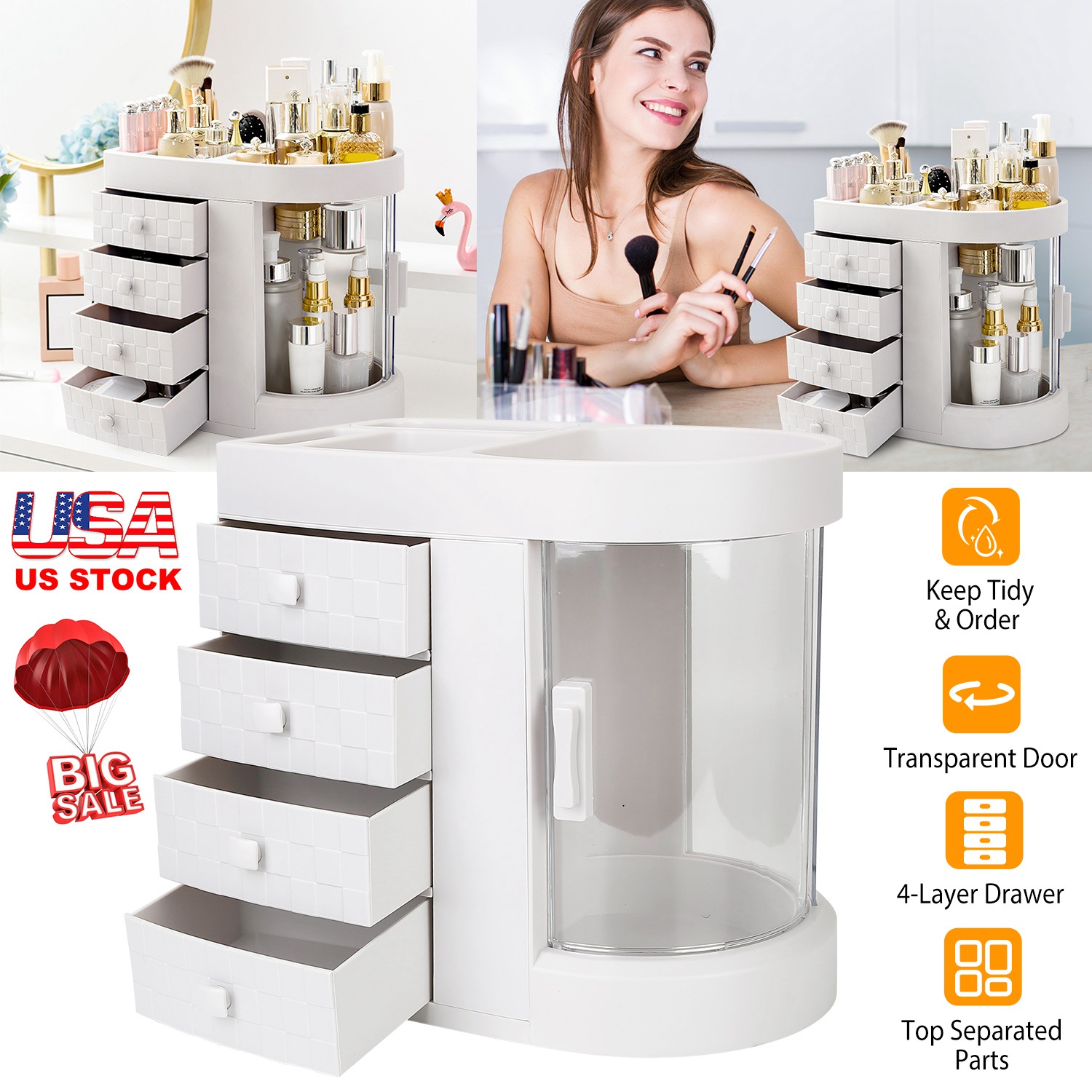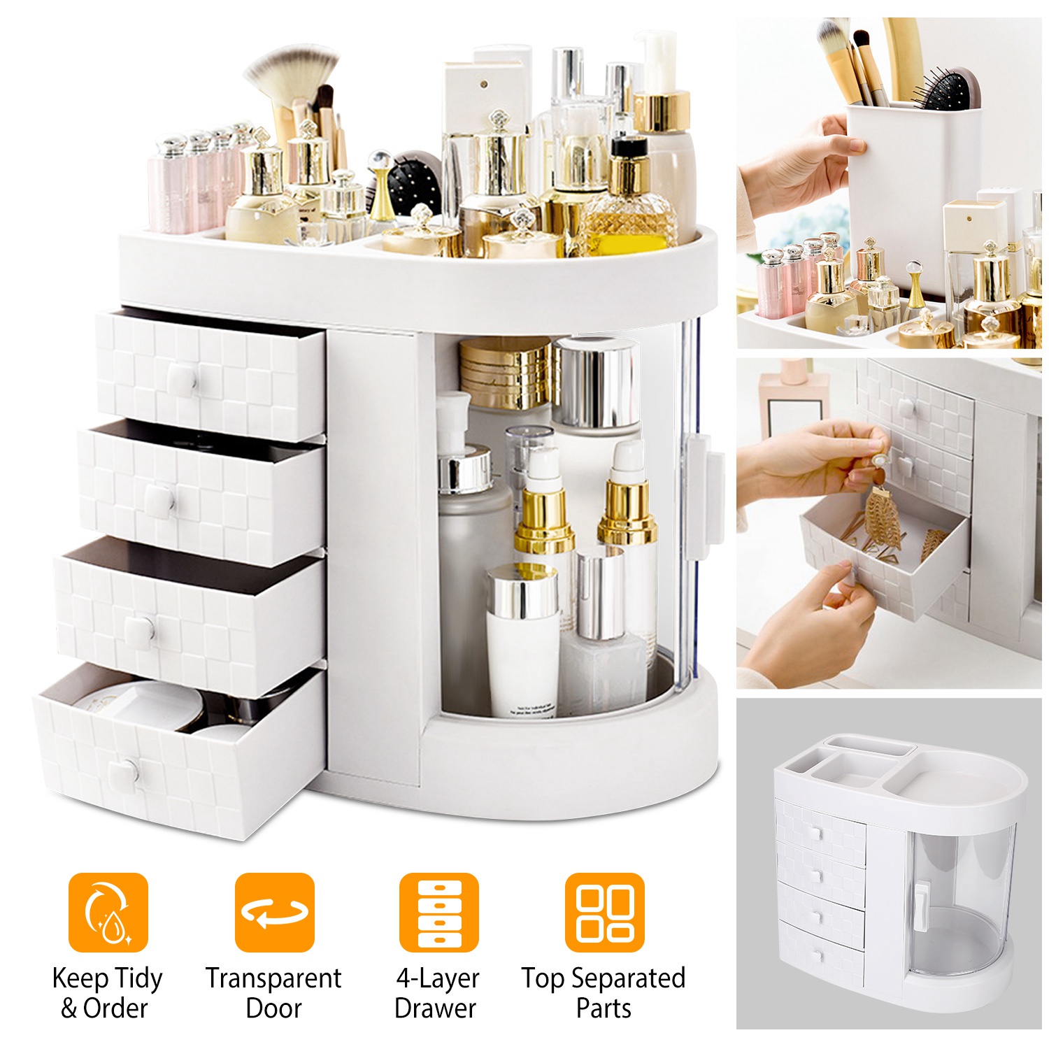 Are you tired of finding your makeups everywhere and feel so messy on your dresser? Designed with a big transparent part, 4 drawers and top separate parts, our jewelry Organizer is perfect to hold your lipstick, foundation, makeup brush, etc.. Good helper to get rid of clutter and keep your table clean and tidy, saving more space. Great for dresser and countertops of bedroom, bathroom, living room and so on.